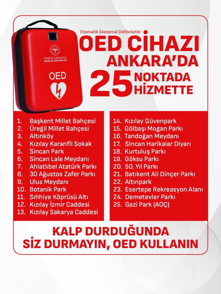 ANKARA (İGFA) – Sağlık Bakanlığı ve ASELSAN iş birliğiyle geliştirilen Otomatik Şok Cihazı (OED) Projesi, Ankara’da halkın kullanımına sunuldu. Yerli mühendislik gücüyle tasarlanan cihazlar, il genelinde belirlenen 25 noktaya yerleştirildi.