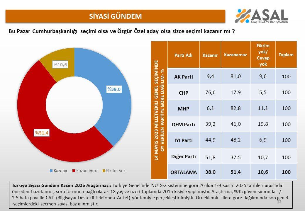 2 bin 15 kişiyle yaptığı ankette “Bu pazar Cumhurbaşkanlığı seçimi olsa ve Özgür Özel aday olsa sizce seçimi kazanır mı?” ve “Türkiye’de bir muhalefet boşluğu olduğunu düşünüyor musunuz?” soruları soruldu.