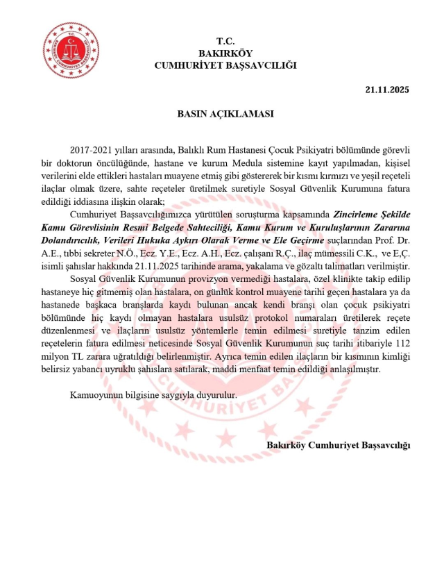 Savcılık açıklamasına göre 2017–2021 yılları arasında Balıklı Rum Hastanesi Çocuk Psikiyatri bölümünde görevli bir doktorun öncülüğünde, Medula sistemine kayıt yapılmadan bazı hastalar muayene edilmiş gibi gösterildi. Hastaneye hiç gitmemiş kişilerin bilgileri kullanılarak sahte protokollerle kırmızı ve yeşil reçeteli on binlerce ilaç yazıldığı ve bu reçetelerin SGK’ya fatura edildiği belirlendi.