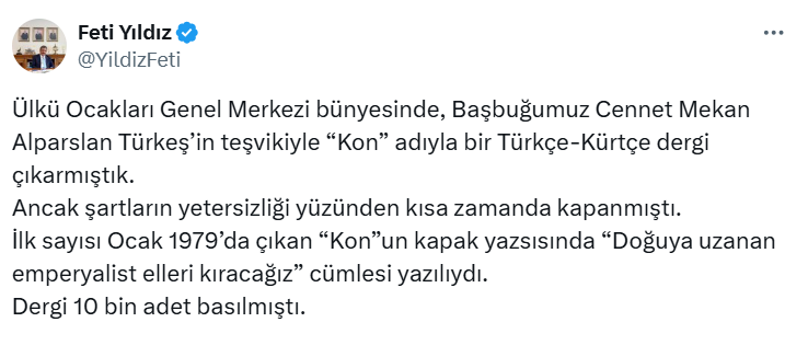X hesabından yaptığı paylaşımda, “Ülkü Ocakları Genel Merkezi bünyesinde, başbuğumuz cennet mekan Alparslan Türkeş’in teşvikiyle ‘Kon’ adıyla bir Türkçe-Kürtçe dergi çıkarmıştık. Ancak şartların yetersizliği yüzünden kısa zamanda kapanmıştı. İlk sayısı Ocak 1979’da çıkan “Kon”un kapak yazsısında “Doğuya uzanan emperyalist elleri kıracağız” cümlesi yazılıydı. Dergi 10 bin adet basılmıştı” notunu düştü.