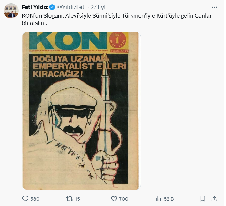İkinci bir paylaşımda derginin kapağını paylaşan Yıldız, “Kon’un sloganı: Alevi’siyle Sünni’siyle Türkmen’iyle Kürt’üyle gelin canlar bir olalım” dedi.