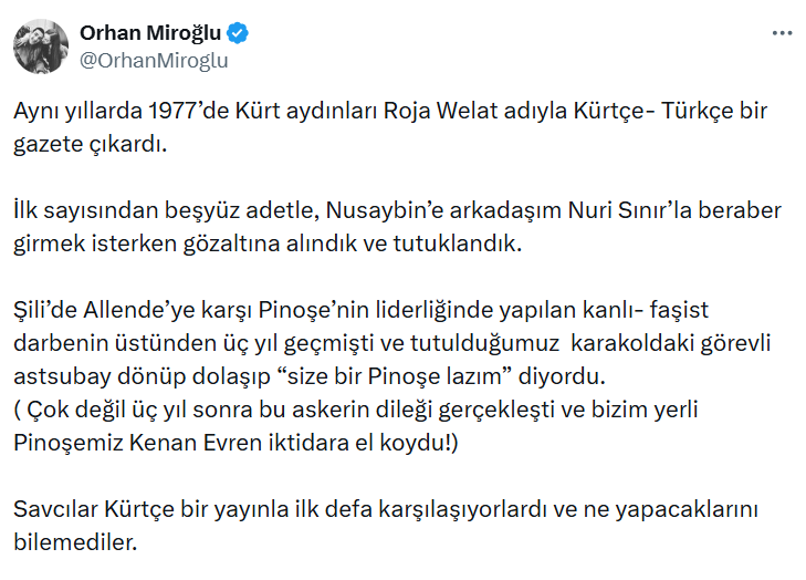 Yıldız’ın paylaşımını alıntılayan AKP’li Orhan Miroğlu, aynı dönemde çıkarılan Türkçe-Kürtçe gazete “Roja Welat”ı anımsattı.