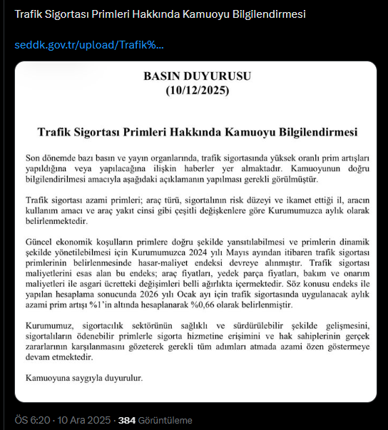“Söz konusu endeks ile yapılan hesaplama sonucunda 2026 yılı ocak ayı için trafik sigortasında uygulanacak aylık azami prim artışı yüzde 1’in altında hesaplanarak yüzde 0,66 olarak belirlenmiştir.”